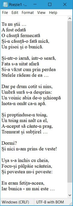 - Scrieți cu Notepad poezia din imagine cu majuscule și diacriticele ă,î,ș,ț,â, exact după cum arată textul din imagine. Salvați fișierul cu numele vostru și aveți grijă să nu se piardă diacriticele.