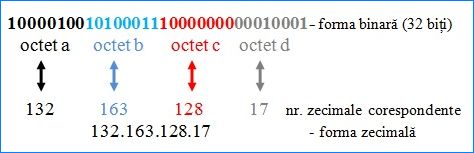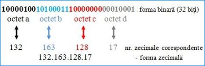 Exemplu : forma zecimală și binară a adresei 132.163.128.17 (1 octet poate stoca un nr. întreg din intervalul [0, 255], pentru patru numere e nevoie de 4*8=32 biți) :